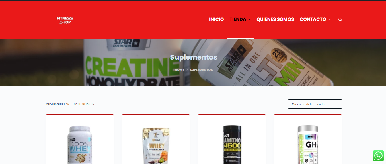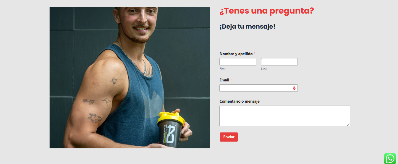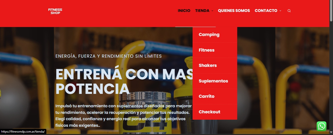 Diseño responsive, adaptable a celulares, tablets y PC. Página principal con presentación clara del gimnasio y sus productos. Tienda online funcional con categorías, fichas de productos y carrito de compras. Integración con Mercado Pago para pagos en Argentina. Formulario de contacto directo. Botón flotante de WhatsApp para atención al cliente.